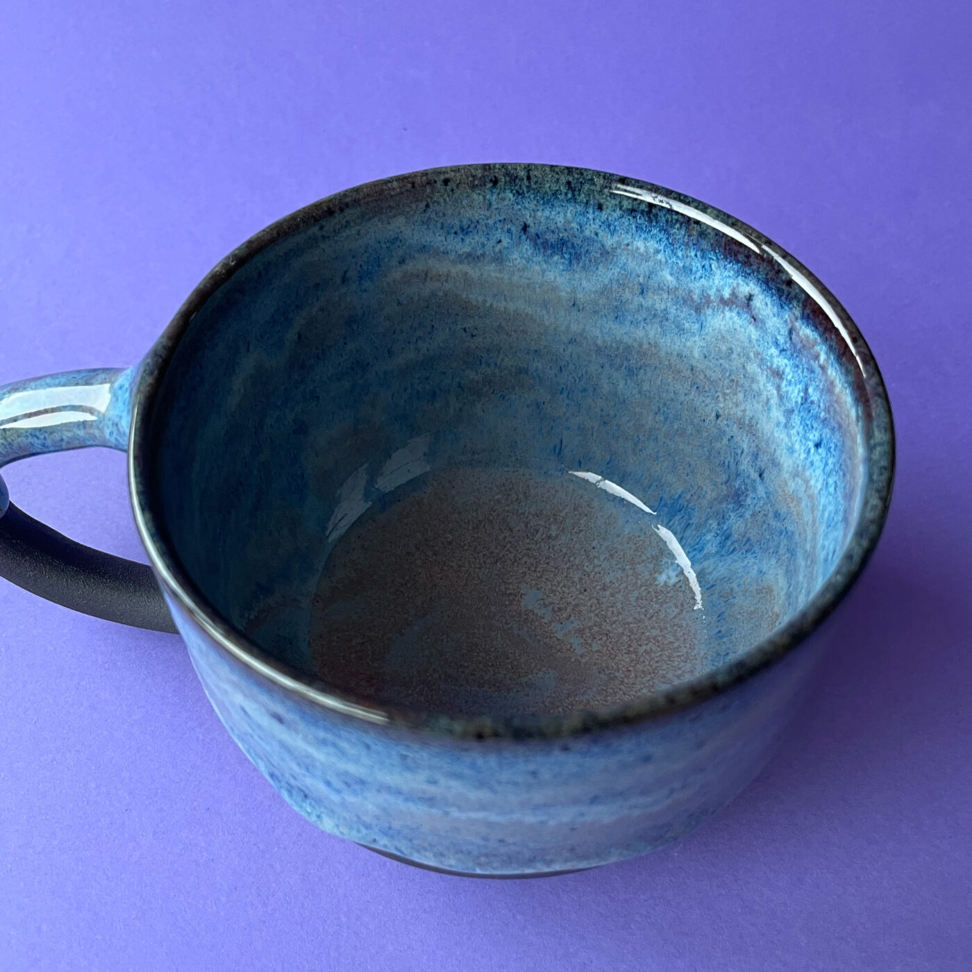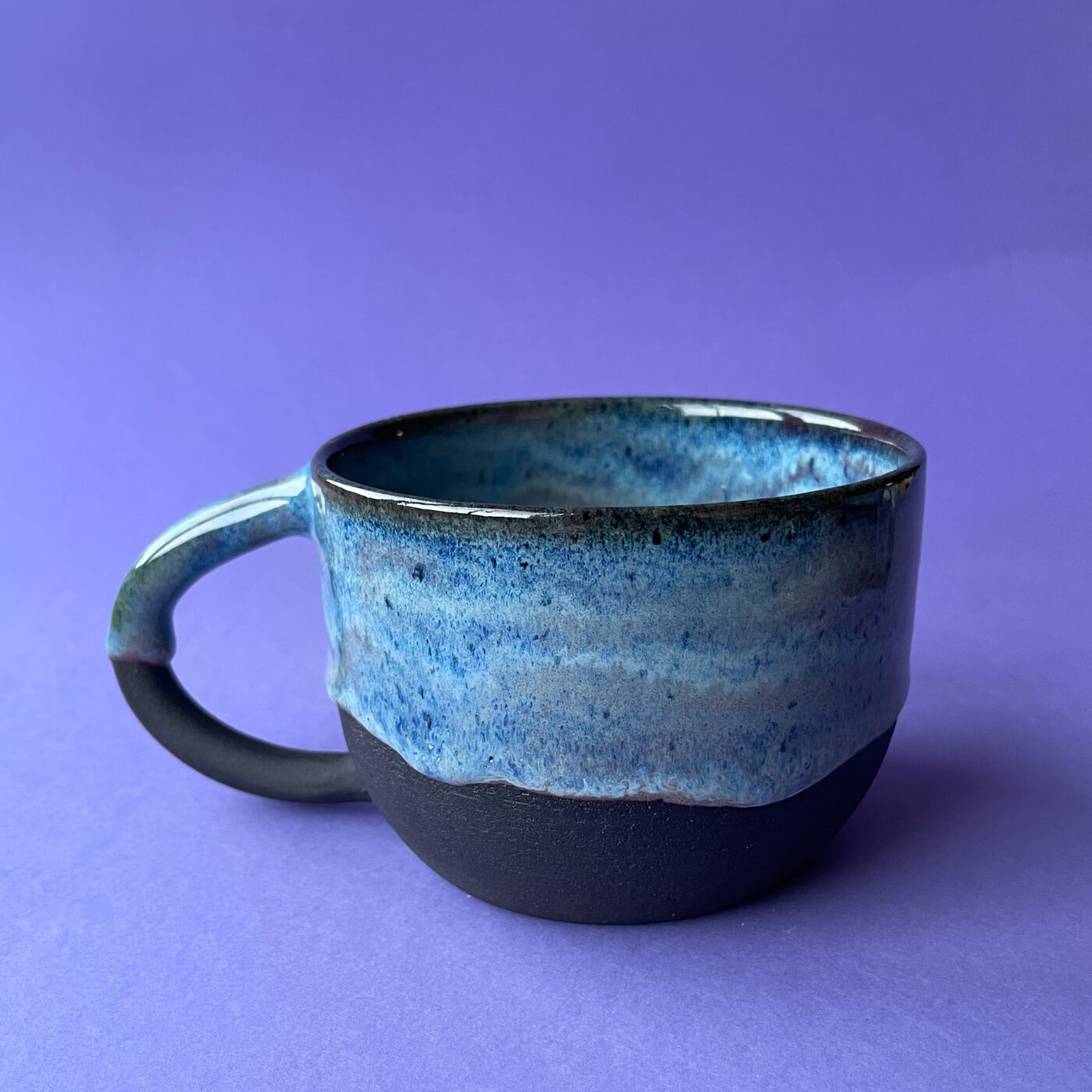 Kubek został wytoczony na kole garncarskim z czarnej gliny.
