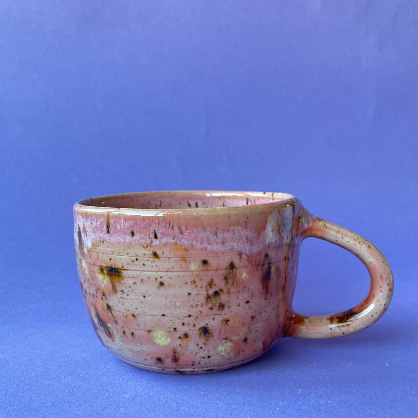 Kubek został wytoczony na kole garncarskim z kremowej gliny w kropeczki.